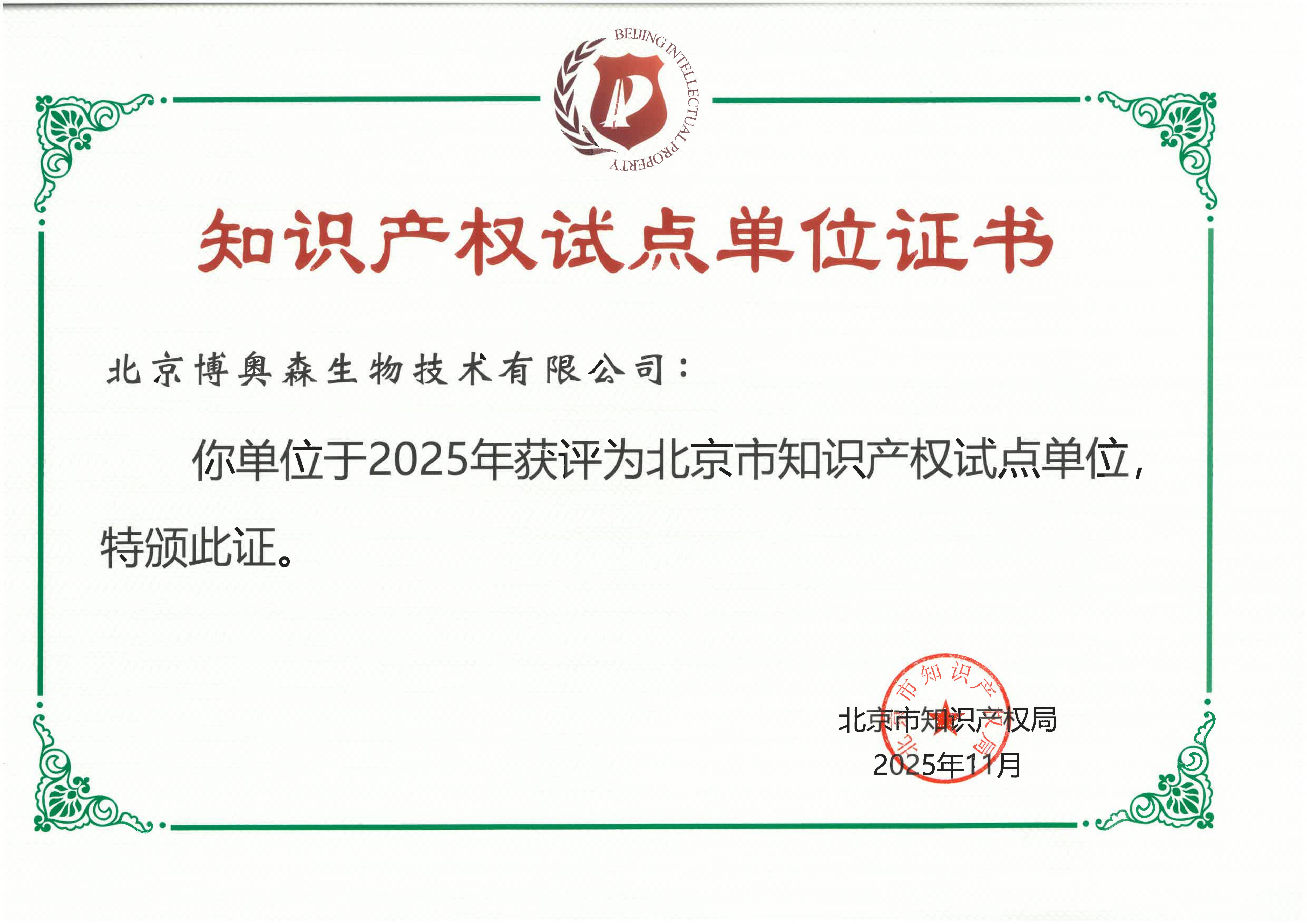 北京博奥森生物技术有限公司正式获评 "北京市知识产权试点单位"! 这份由北京市知识产权局授予的称号,不只是一份官方认可的荣誉,更是对博奥森24 年来在自主创新、技术积淀与知识产权保护领域持续投入的高度肯定。在生命科学赛道上,我们始终坚信:每一份原创成果都是推动科研进步的基石,每一项核心技术都值得被用心守护。
