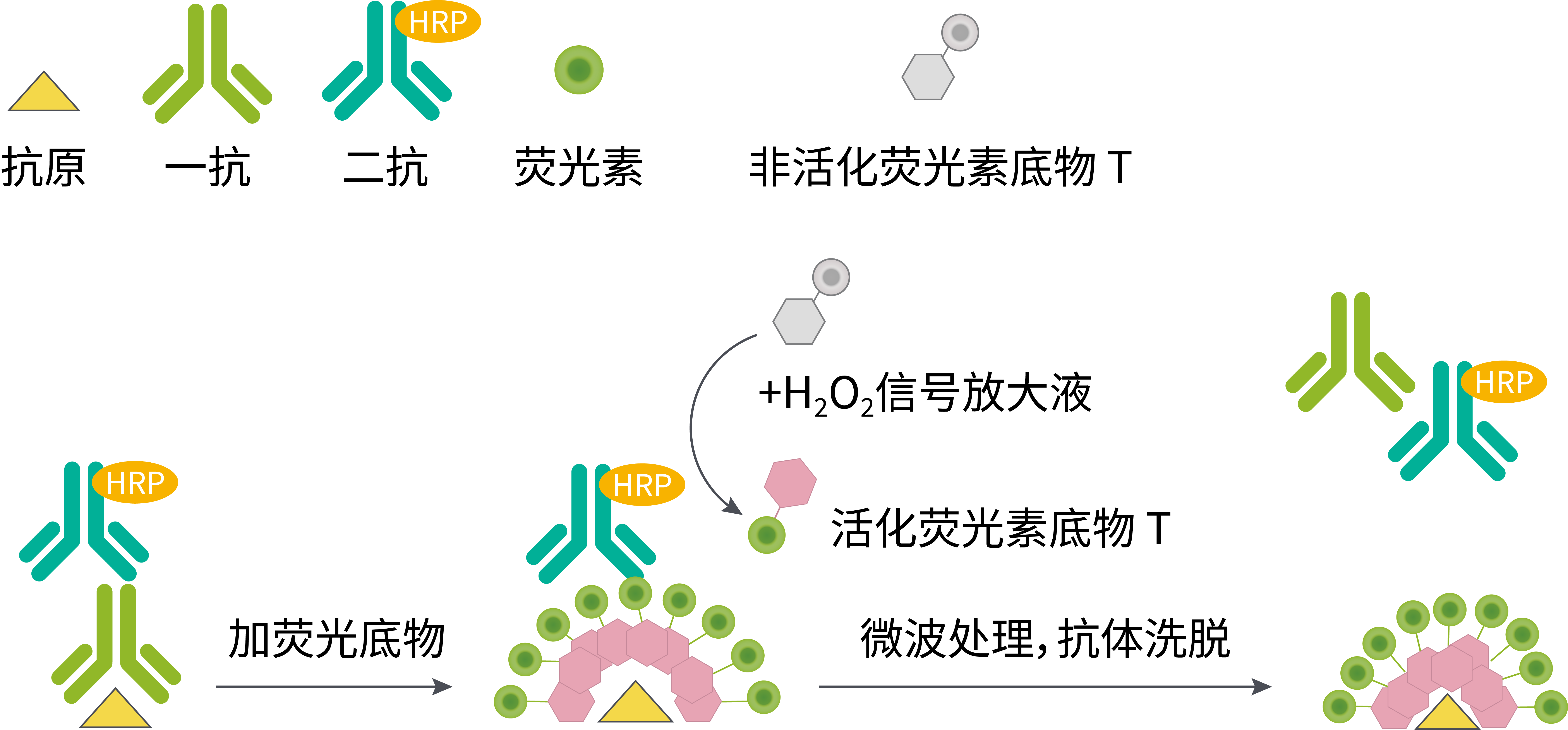 酪酰胺信号放大(TSA, Tyramide signal amplification)技术是一种利用辣根过氧化酶(HRP)对靶蛋白进行原位标记的酶学检测方法。其原理是利用酪胺(Tyramide)的过氧化物酶反应,酪胺荧光素底物在HRP和H202的作用下被活化,活化的荧光底物能与目标蛋白上的酪氨酸等残基共价结合,导致在抗原-抗体结合位点大量沉积荧光素,实现信号放大。通过热修复或者抗体洗脱液洗去前一轮非共价结合的抗体,而荧光素稳定结合在蛋白上,进行下一轮染色。直至所有抗体孵育结束,进行核染色,封片,扫描。