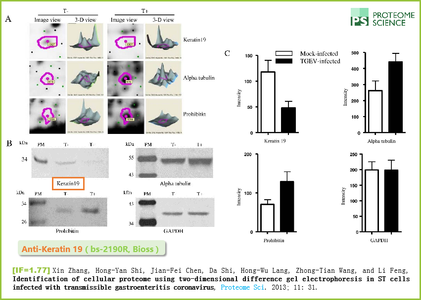 本文通过传染性肠胃炎病毒(TGEV)感染猪睾丸细胞后的蛋白组学变化,发现23种蛋白上调,10种蛋白下调(图A),并用WB鉴定角质蛋白19(keratin 19)、a-微管蛋白(a- tubulin)和抗增殖蛋白(prohibitin)(图B)参与了病毒的感染过程,表明该病毒感染与细胞结构完整性、囊泡运输及RNA处理、蛋白合成调控等有关。