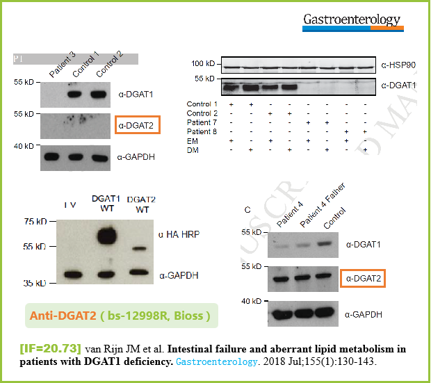 文中利用WB对目标蛋白进行了半定量研究。在这篇文章中,Rijn等通过WB方法发现先天性腹泻(CDD)病人及其父母DGAT1蛋白表达缺失。作者通过DNA测序分析了DGAT基因,确定了DGAT1基因五个新的纯合变异体,其RT-PCR发现cDNA异常切割,因此DGAT蛋白无表达。这造成细胞脂代谢异常。文章通过基因敲除法构建了DGAT1缺失型类小肠器官,还在Caco-2细胞系中重组表达了DGAT1和DGAT2,目的是体外模拟DGAT蛋白缺失及重建后对脂代谢的影响。类小肠器官及细胞系中DGAT蛋白的表达都是通过WB方法得以确定的。该实验证实,敲除DGAT1蛋白造成脂代谢紊乱,对细胞造成脂毒性,重建DGAT1或DGAT2可恢复脂代谢。