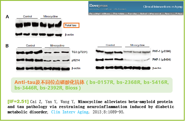 糖尿病代谢紊乱可能会增加阿尔茨海默症(AD病)风险,其病理机制是导致Ab和tau蛋白表达量的增加。在Clin Interv Aging杂志的文章中,作者发现四环素衍生药物二甲胺四环素可降低糖尿病模型大鼠的Ab蛋白表达,tau蛋白磷酸化及炎症因子如IL-1b等的表达。证实该药物是通过抑制糖尿病代谢紊乱所引起的炎症反应而淀粉样前体的形成。WB结果显示,药物处理前后总tau蛋白并无变化,但神经元内斑块标志物T231和S214磷酸化tau的磷酸化程度明显降低,胞间斑块标志物PHD指形蛋白1(PHF-1)的磷酸化也明显降低。