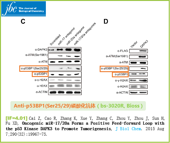 Cai等在JBC上发表的文章,揭示了微小RNA在肿瘤发生中的调节作用。研究发现微小RNA miR-17/20a靶向抑制p53的核心激酶DAPK3(死亡相关蛋白激酶3)的表达,去除这些微小RNA将导致依赖于p53的微小RNA转录抑制被去除,从而形成一个正反馈环,促进肿瘤形成,它们被称为原癌微小RNA(oncomiRs)。C图清楚显示了当对Hela细胞转入miR-17、miR-20a或miR-17/20a拮抗剂后,DAPK3蛋白表达增加,双链DNA不稳定性的标志物ATM(Ser-1981)、p53BP1(Ser-25/29)蛋白丝氨酸磷酸化程度增高,而各自总蛋白水平并没有变化。D图进一步确认了这些磷酸化水平升高是由DAPK3表达量升高引起的。p53磷酸化水平升高将导致其抑制原癌微小RNA转录的水平下降,进一步提高DAPK3激酶的表达。该研究补充了原有的通过E2F家族蛋白激活miR-17/20a的负反馈调节通路。