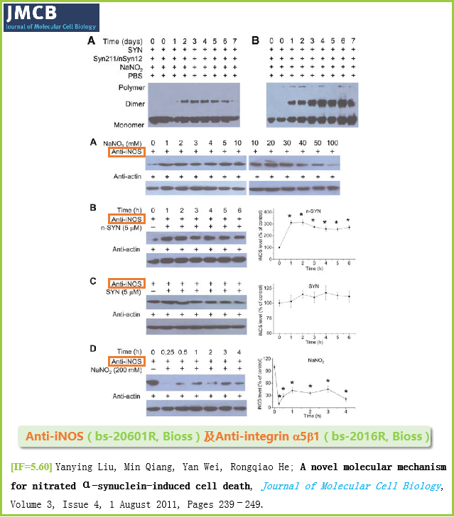 硝基化促使a-突触核蛋白(a-synuclein)寡聚,以及寡聚化的a-synuclein促使人神经胶质瘤细胞SH-SY5Y凋亡,并呈时间剂量效应的研究。WB结果显示硝基化程度加深,a-synuclein呈现了二聚及多聚特性。硝基化的a-synuclein激活了iNOS并抑制了FAK,这两条信号可能都参与了促SH-SY5Y凋亡作用。作者还发现integrin抗体部分抑制了细胞凋亡,将已有的integrin/FAK/caspase 3信号通路改变为integrin-iNOS/-FAK/caspase 3信号通路。