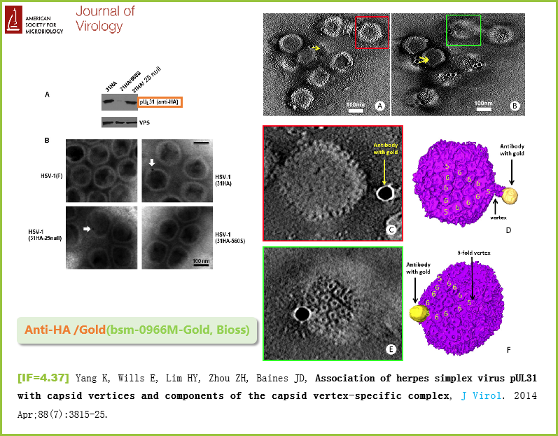 本文利用标签蛋白研究蛋白的功能区。Yang等在研究单纯疱疹病毒(HSV)出芽复合体的形成机制时,设想病毒蛋白pUL31的C端25个Aa对于其结合衣壳蛋白及核蛋白形成核出芽复合体(NEC)非常重要,于是设计带有HA标签的pUL31蛋白31HA,缺少C端25个Aa的31HA/560S,以及缺少pUL25区的31HA/25 null,发现pUL31及缺少pUL25的pUL31可以结合衣壳蛋白,但缺少C端25个Aa的31HA/560S不能结合。利用金标记HA抗体可在电镜下观察到衣壳蛋白顶端与pUL31形成复合体的情形。