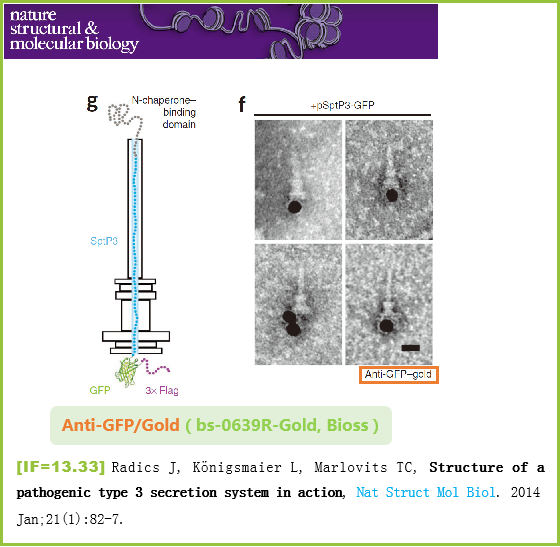 Radics等在脂膜上设计了精巧的针形通道,模拟在细菌膜上的3型分泌系统(注射体,”injectisomes”),研究注射体的结构及工作原理。作者通过设计目标蛋白SptP(WT)及其FLAG和GFP标签融合蛋白,FLAG标签可用于示踪蛋白在胞内和胞外的分布。由于带有GFP标签的融合蛋白不能通过该通道,GFP标签起到了使SptP形成蛋白-通道复合体的作用,可用冷冻电镜解析复合体的结构。利用金标抗GFP抗体可在电镜下显示复合体的形成。