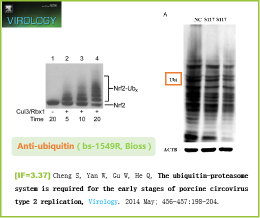 泛素化-蛋白酶体系统对于错误蛋白降解具有重要意义。左图显示Nrf2蛋白在泛素连接酶作用时间延长后,泛素化程度逐渐增加。若将各时间点的Nrf2蛋白结构解析,即可将该蛋白的结构研究与功能研究相结合。在Virology的这篇文献中,作者发现蛋白酶体抑制剂MG132和lactacystin可显著降低猪II型圆环病毒(PCV2)早期感染的滴度,并通过对泛素基因的沉默实验,发现其也显著降低PCV2滴度,由此推断泛素-蛋白酶体系统是PCV2的早期复制所必须的。
