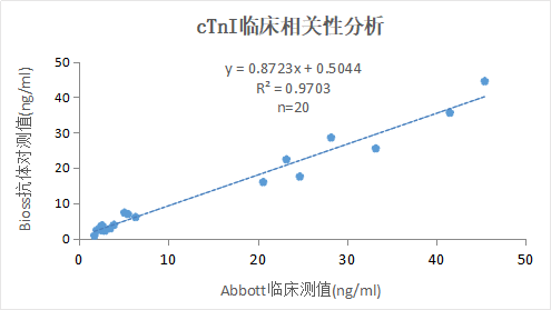 我司推荐的抗体对组合均通过朗道液态心肌质控品及雅培定值临床样本验证,可以成功识别样本中天然的cTnI,如下例所示:采用抗体对(2+1模式)对20份临床定值血清样本进行检测,Bioss-cTnI抗体对检测Abbott定值临床血清样本,二者的相关性>0.95,可满足临床检测要求。