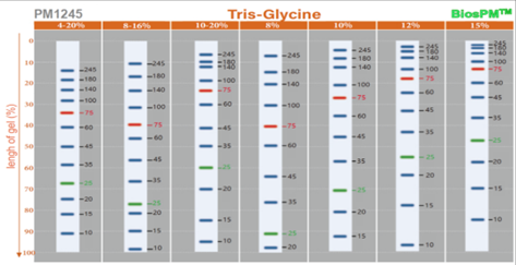 本产品由跨度从10~245kD的12种纯化天然蛋白混合而成,各条带浓度约为0.2~0.4 mg/ml;其中75kD条带为红色,25kD为绿色,其余条带为蓝色。本产品适用于SDS-PAGE 电泳时变性蛋白样品的分子量参照,并可实时观察蛋白样品的电泳分离状况,也可用于检测Western blot 的转膜效率。由于共价结合的染料会影响蛋白质分子的电泳迁移率,本产品可用于粗略地估计目的蛋白样品的分子量。