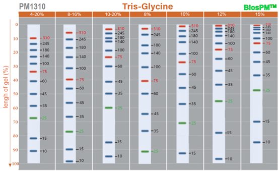 本产品由跨度从 10~310kD 的12 种纯化天然蛋白混合而成,各条带浓度约为 0.2~0.4 mg/ml。其中 75kD、310KD条带为红色,25kD 为绿色,其余条带为蓝色。本产品适用于 SDS-PAGE 电泳时变性蛋白样品的分子量参照,并可实时观察蛋白样品的电泳分离状况,也可用于检测 Western blot 的转膜效率。由于共价结合的染料会影响蛋白质分子的电泳迁移率,本产品可用于粗略地估计目的蛋白样品的分子量。