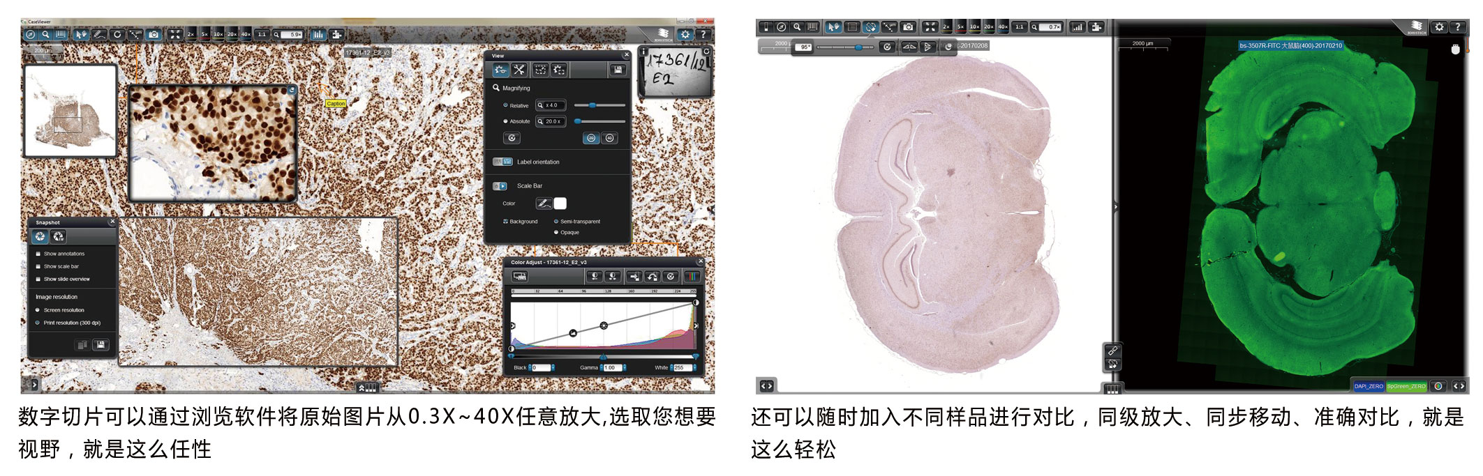 信息共享全面传输 方便浏览与传输。应用者可随时随地对显微切片任何区域进行不同放大倍率的浏览(2x,4x,10x,20x,40x,100x),资料传输不必受到时间和空间的约束。浏览时为光学放大而非数码放大,因此不存在图像信息失真和细节不清的问题,这与普通计算机浏览图片缩放只改变图像大小而无法改变分辨率有本质的区别。